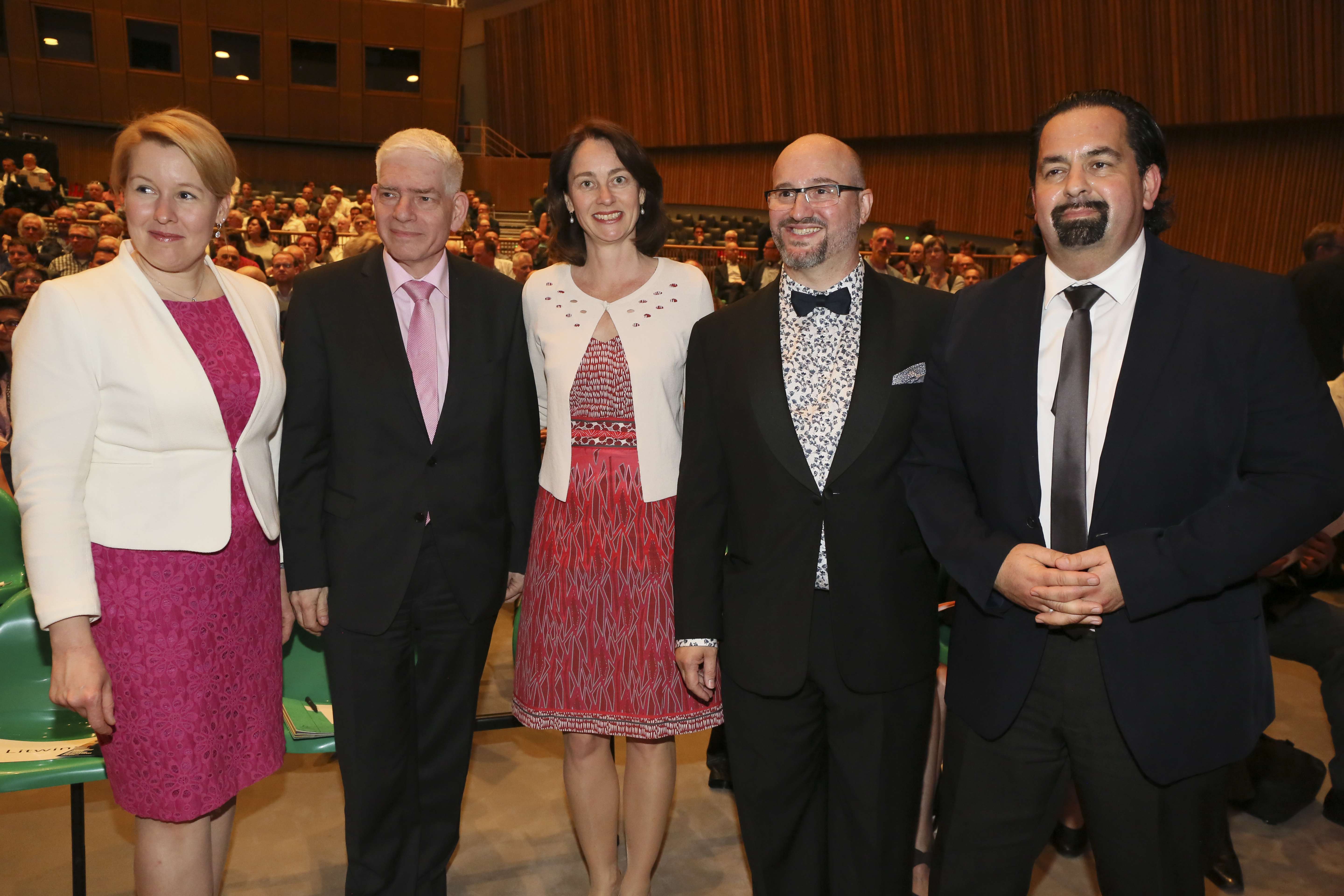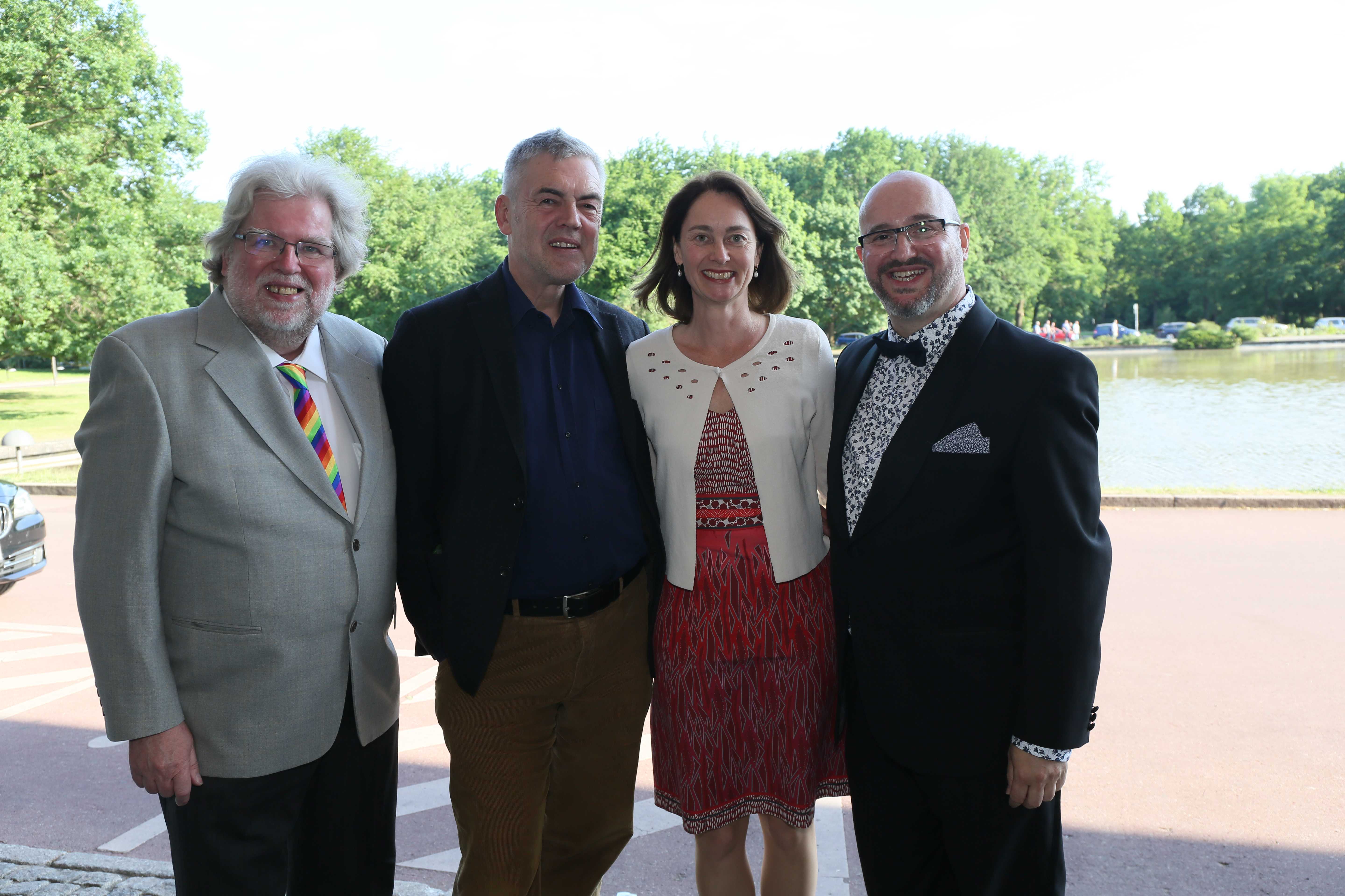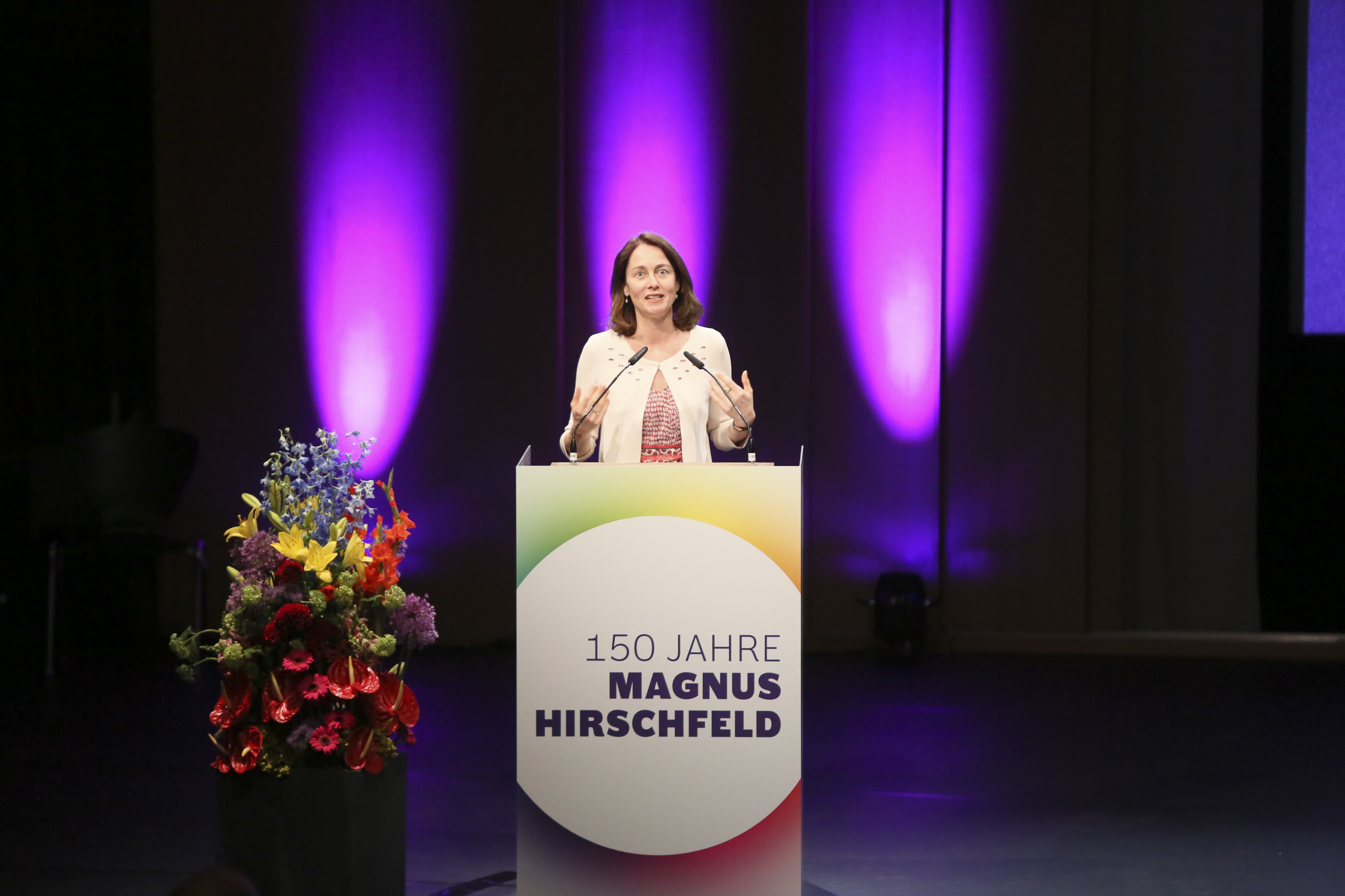 Am ehemaligen Sitz des Instituts für Sexualwissenschaft, dem heutigen Haus der Kulturen der Welt, fand am 14. Mai 2018 der Festakt zum 150. Geburtstag von Magnus Hirschfeld statt. Wir konnten annähernd 900 Gäste aus der LSBTIQ*-Community, aus Politik, Kultur, Gesellschaft, Wirtschaft, Religion und Sport begrüßen. Besondere Ehrengäste waren die 14 Verwandten aus dem Familienkreis Magnus Hirschfelds, die auf Einladung der Magnus-Hirschfeld-Gesellschaft aus Australien, den USA und Italien angereist waren. Neben den Bundesministerinnen der Justiz und für Verbraucherschutz, Dr. Katarina Barley, und für Familie, Senioren, Frauen und Jugend, Franziska Giffey, nahmen an der Veranstaltung auch der Präsident des Zentralrats der Juden in Deutschland, Dr. Josef Schuster, und der Vorsitzende des Zentralrats der Muslime in Deutschland, Aiman Mazyek, teil. Kooperationspartner des Festakts waren der Förderkreis der Bundesstiftung Magnus Hirschfeld, die Magnus Hirschfeld-Gesellschaft e. V., die Senatsverwaltung für Kultur und Europa, das Abraham-Geiger-Kolleg und der Verein der Freund*innen des Elberskirchen-Hirschfeld-Hauses (E2H) – Queeres Kulturhaus in Berlin i. Gr.