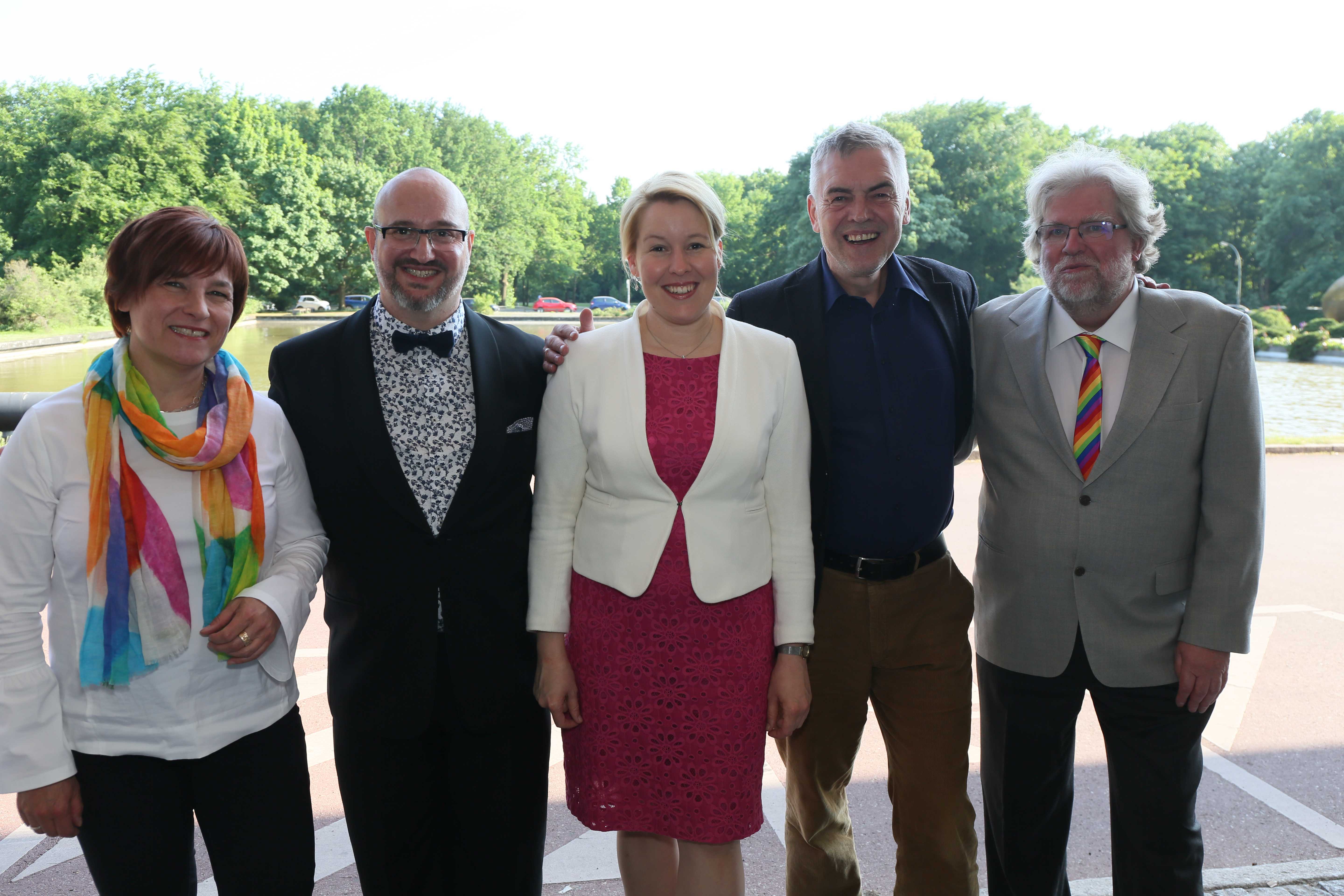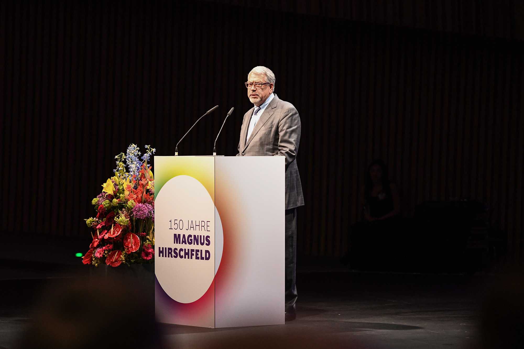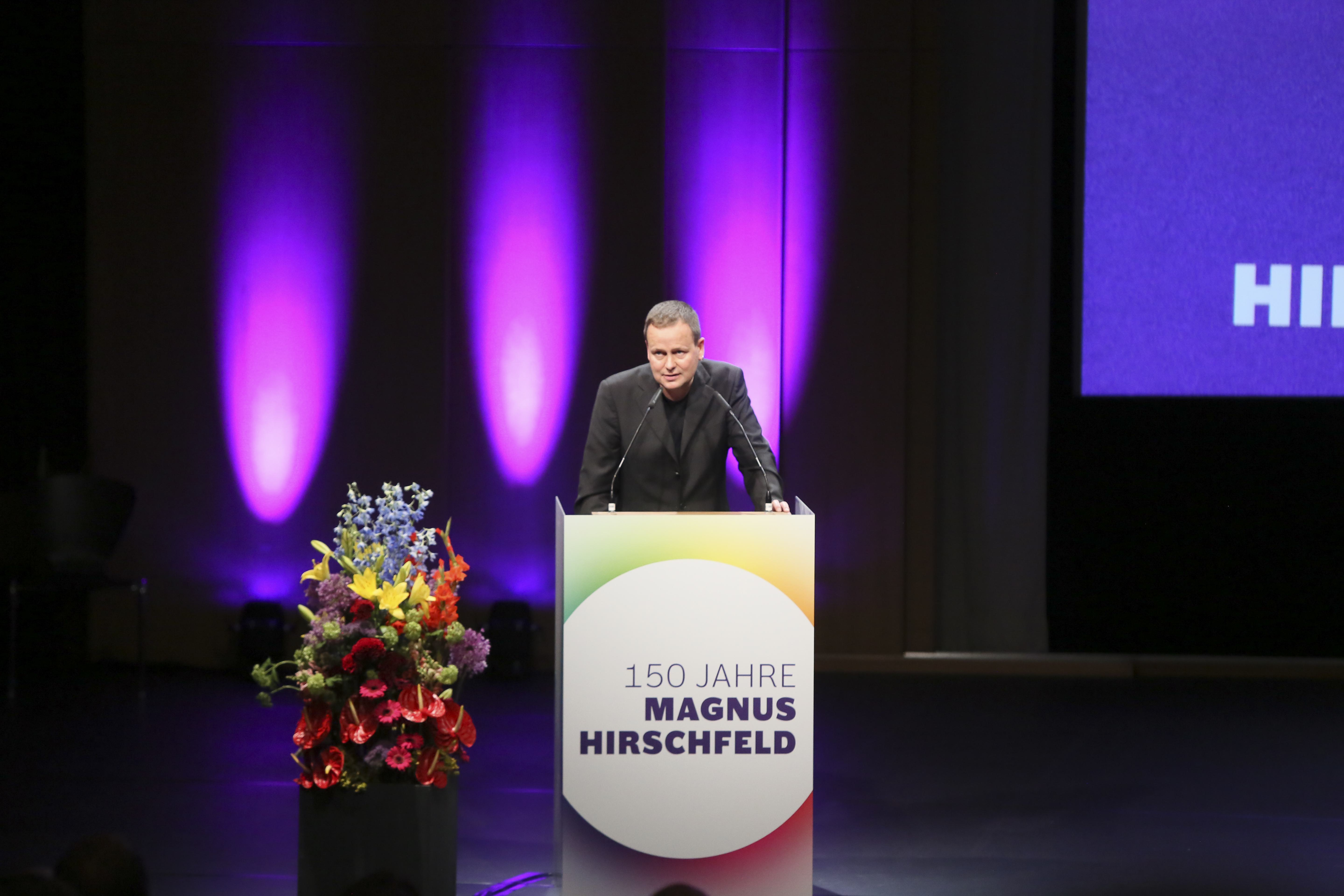 Am ehemaligen Sitz des Instituts für Sexualwissenschaft, dem heutigen Haus der Kulturen der Welt, fand am 14. Mai 2018 der Festakt zum 150. Geburtstag von Magnus Hirschfeld statt. Wir konnten annähernd 900 Gäste aus der LSBTIQ*-Community, aus Politik, Kultur, Gesellschaft, Wirtschaft, Religion und Sport begrüßen. Besondere Ehrengäste waren die 14 Verwandten aus dem Familienkreis Magnus Hirschfelds, die auf Einladung der Magnus-Hirschfeld-Gesellschaft aus Australien, den USA und Italien angereist waren. Neben den Bundesministerinnen der Justiz und für Verbraucherschutz, Dr. Katarina Barley, und für Familie, Senioren, Frauen und Jugend, Franziska Giffey, nahmen an der Veranstaltung auch der Präsident des Zentralrats der Juden in Deutschland, Dr. Josef Schuster, und der Vorsitzende des Zentralrats der Muslime in Deutschland, Aiman Mazyek, teil. Kooperationspartner des Festakts waren der Förderkreis der Bundesstiftung Magnus Hirschfeld, die Magnus Hirschfeld-Gesellschaft e. V., die Senatsverwaltung für Kultur und Europa, das Abraham-Geiger-Kolleg und der Verein der Freund*innen des Elberskirchen-Hirschfeld-Hauses (E2H) – Queeres Kulturhaus in Berlin i. Gr.